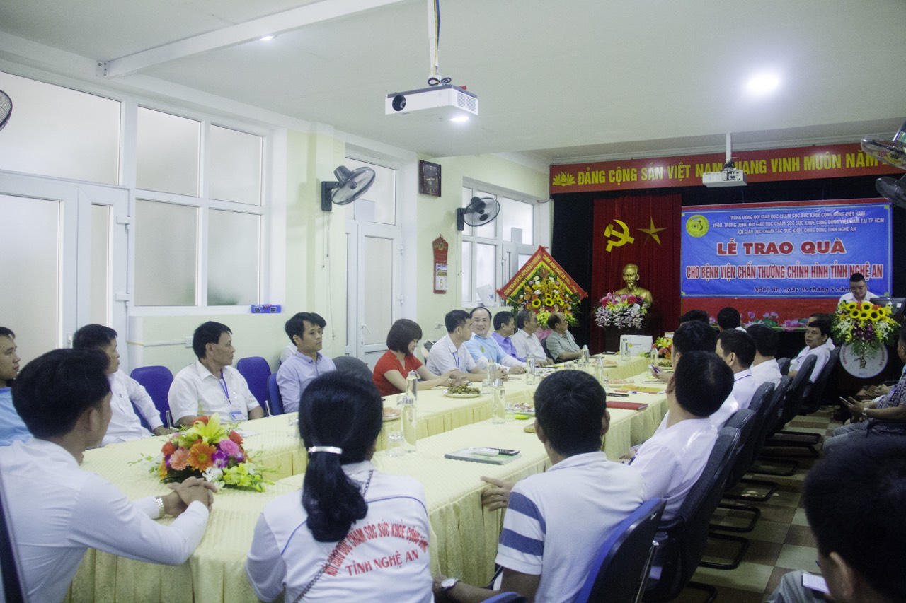 Tại buổi lễ, đại diện Hội GDCSSKCĐ đã trao những món quà thiết thực, gồm: máy rửa tay sát khuẩn, nước rửa tay sát khuẩn và khẩu trang cho BVCTCHNA.