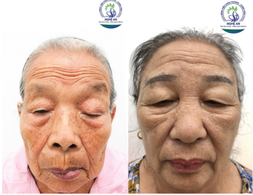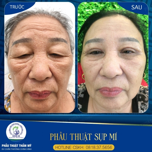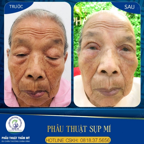 Đến với khoa, cụ được các bác sĩ thăm khám và thực hiện điều trị bằng phẫu thuật cắt mí. Loại bỏ hoàn toàn tình trạng da chùng, mỡ thừa, tình trạng sụp mí của cụ khá nặng nên bác sĩ phải can thiệt vào cơ nâng mi, là làm ngắn cơ nâng mi và cắt bỏ một phần cơ vòng mi. Giờ đây cụ đã nhìn mọi thứ dễ dàng hơn, không những thế cụ còn trông trẻ ra, cuộc sống của cụ vui vẻ và phấn khởi hơn trước rất nhiều. Khoa phẫu thuật tạo hình thẩm mỹ - Bệnh viện Chấn thương chỉnh hình Nghệ An địa chỉ làm đẹp uy tín, tin cậy của mọi khách hàng.