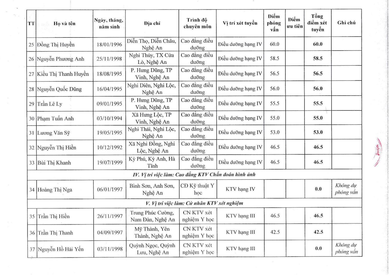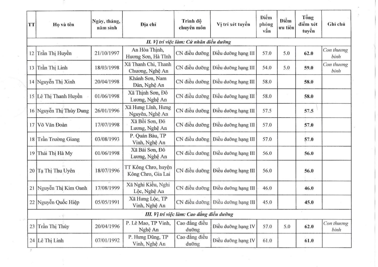 Bệnh viện Chấn thương Chỉnh hình Nghệ An thông báo bảng tổng hợp điểm xét tuyển viên chức năm 2021 như sau: