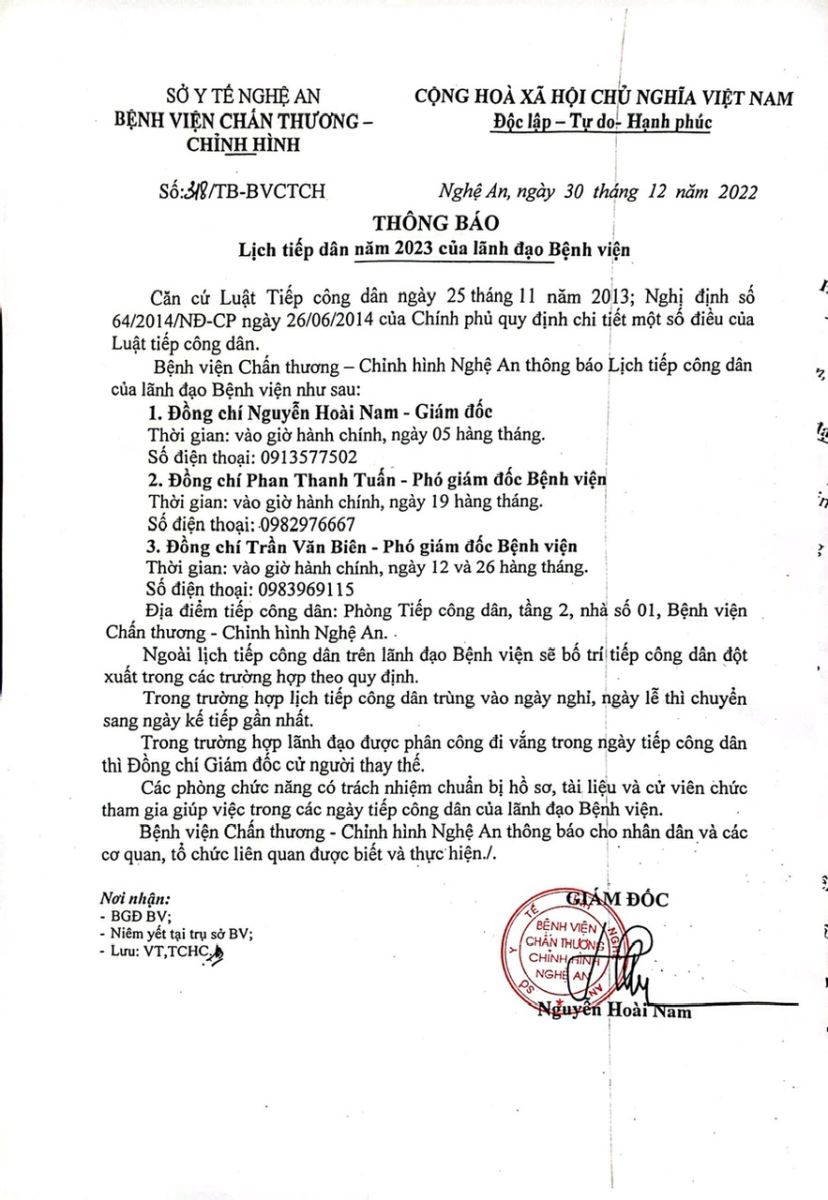 Bệnh viện Chấn thương - Chỉnh hình Nghệ An thông báo về lịch tiếp dân năm 2023 như sau: