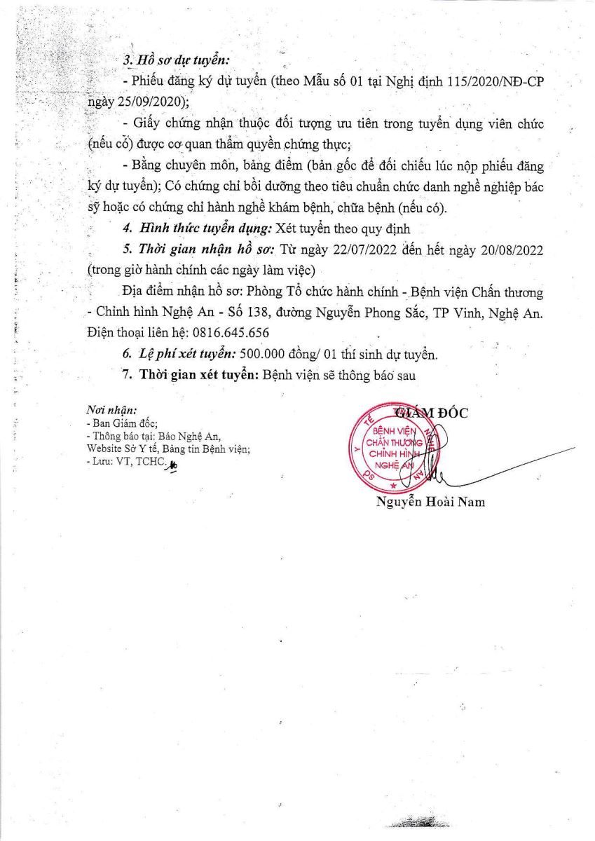 Bệnh viện Chấn thương Chỉnh hình Nghệ An xin thông báo tuyển dụng viên chức bổ sung năm 2021 như sau: