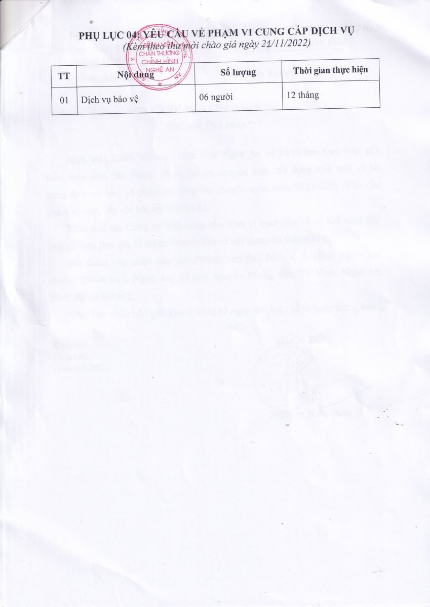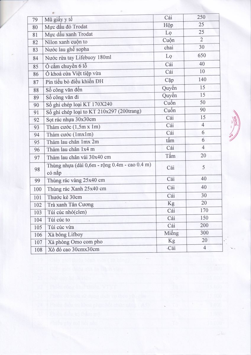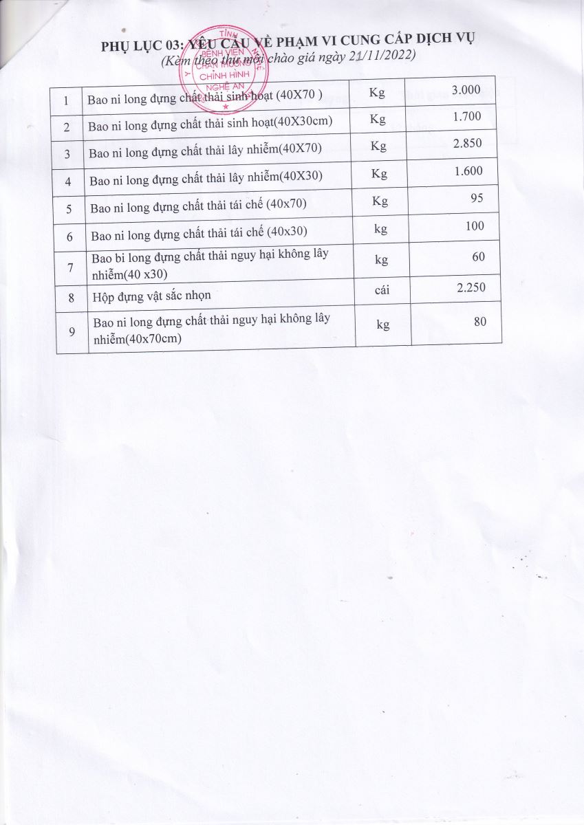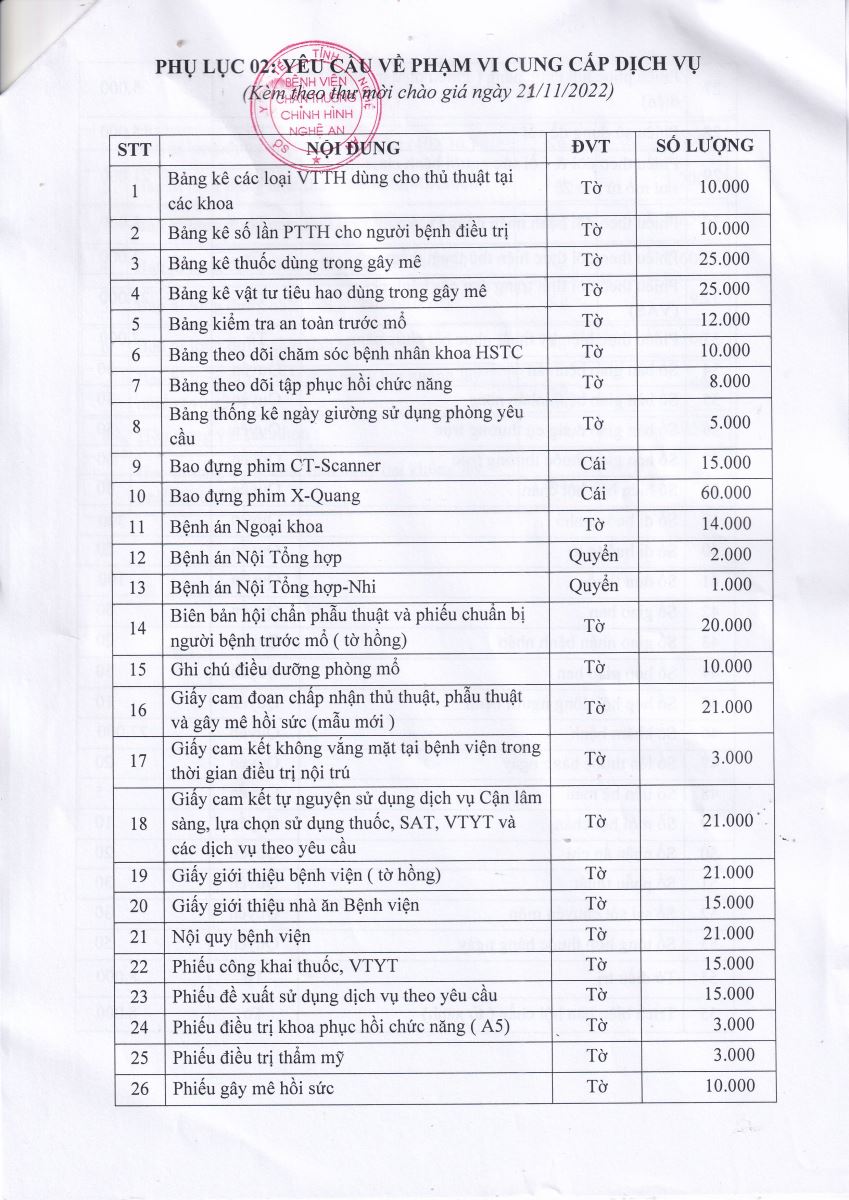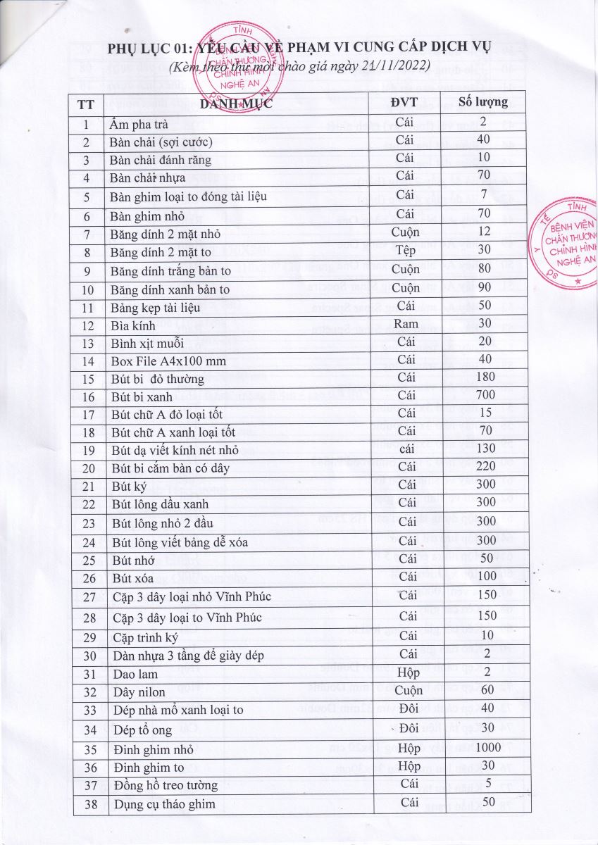 Bệnh viện Chấn thương Chỉnh hình Nghệ An thông báo mời chào giá về việc cung cấp văn phòng phẩm, ấn chỉ chuyên môn, túi đựng chất thải và dịch vụ bảo vệ phục vụ công tác chuyên môn năm 2023 như sau: